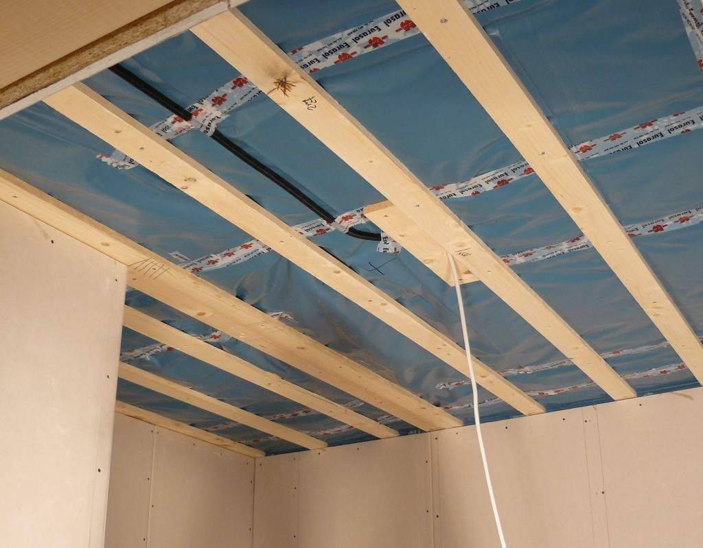 За потолком можно установить материалы для повышения тепло- и звукоизоляции помещения.