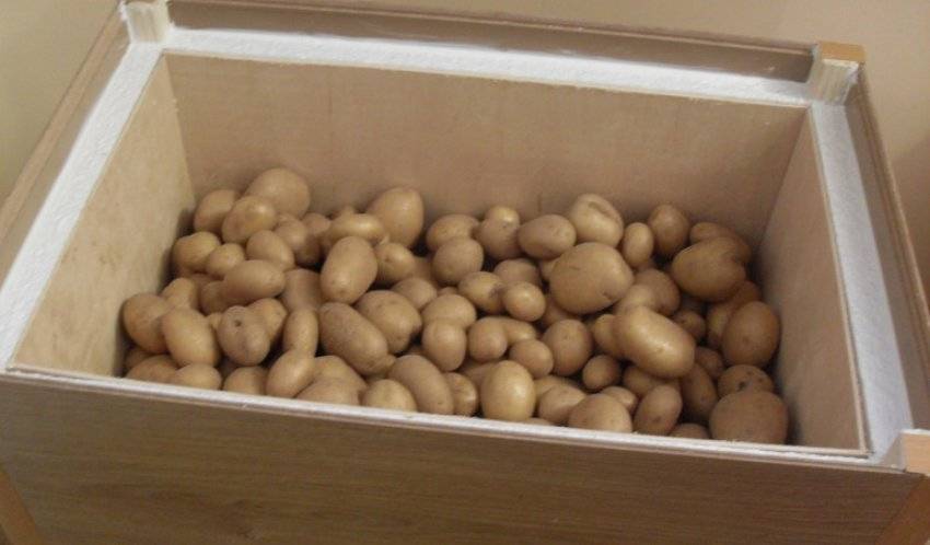 Если у вас нет возможности хранить картофель в погребе, то в квартире можно хранить его на балконе. Но для этого клубни нужно уложить в двойные тканевые мешки, которые следует поместить в деревянные ящики. При этом емкость с картофелем должна помещаться в такой же ящик, но большего размера. Промежутки между стенками следует заполнить утеплителем. Сверху ящики нужно накрыть двумя крышками, между которыми также уложить слой утеплителя. Если все сделать правильно, то урожай картофеля сможет выдержать морозы до –20°С.