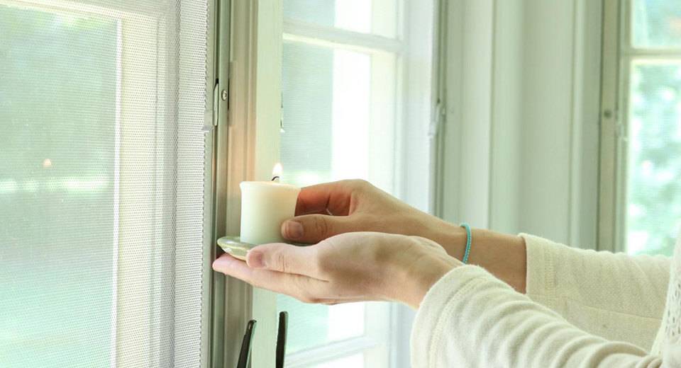 Для того чтобы устранить причину неприятного сквозняка, возникающего в области оконного проема, в первую очередь нужно найти место, откуда дует. Для этого необходимо взять в руки зажженную свечу и поднести ее к створке окна, в местах ее прилегания к раме. Особенно внимательным нужно быть на стыках оконной рамы с откосами.