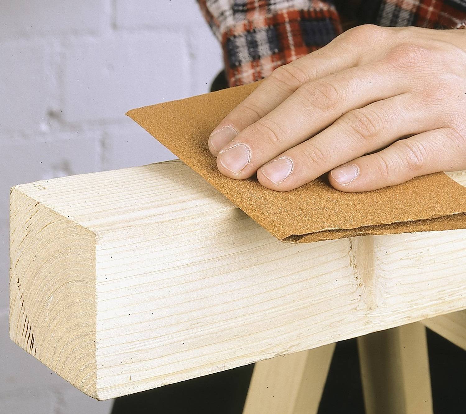 - Ошкуривание поверхности. Для этого процесса используют наждачную бумагу с разной степенью абразивного покрытия. Начинать следует с более крупной, постепенно доходя до самой мелкой. Поверхность готова, если, проведя по ней рукой, не ощущаем никаких неровностей.