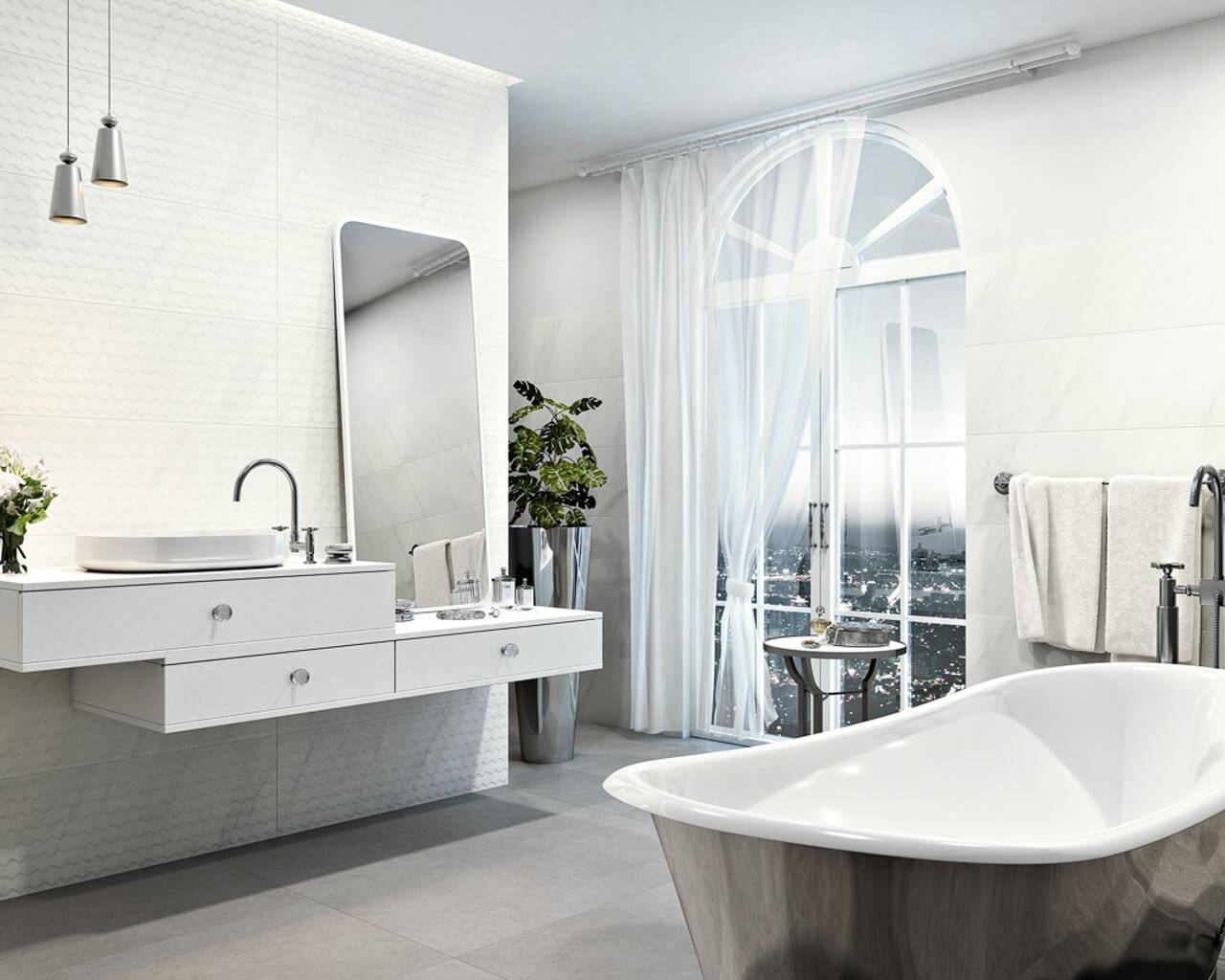 Четкая геометрия рисунка может визуально расширить пространство с использованием монохромной плитки.