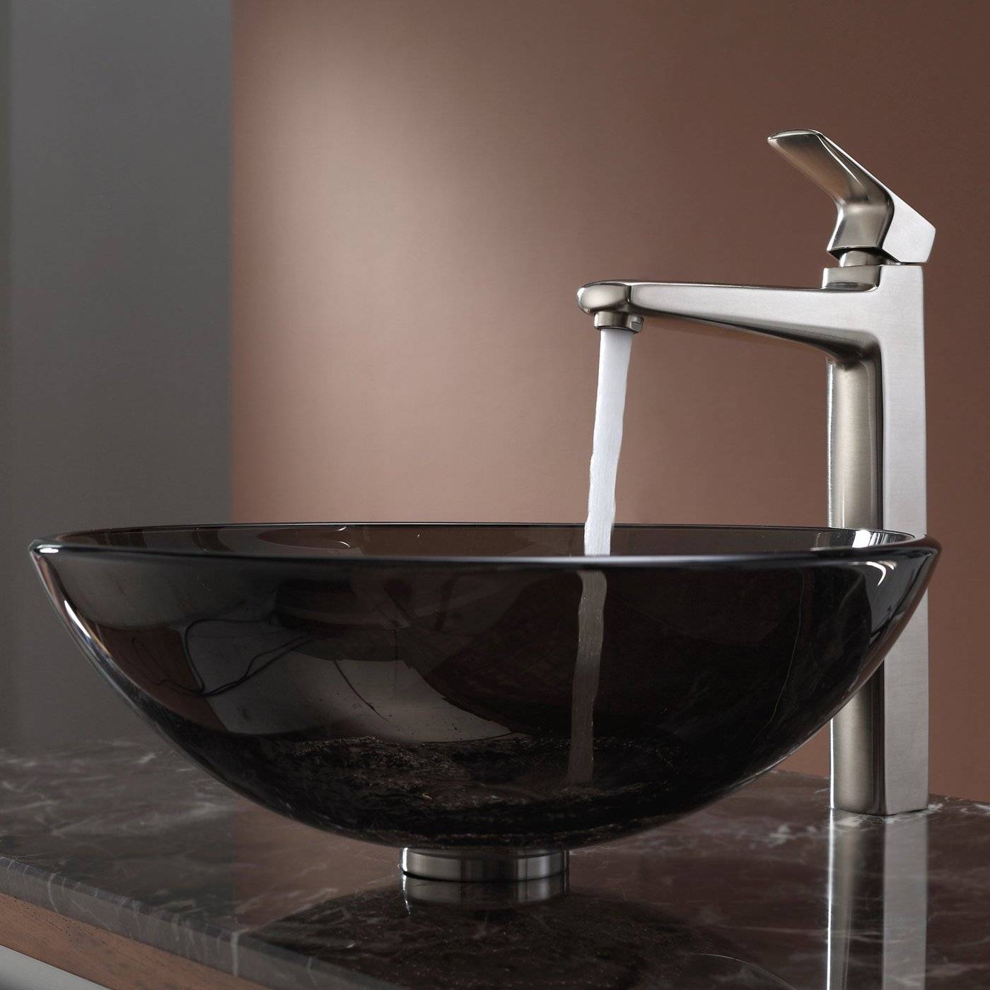 - Чтобы минимизировать нагрузку на поверхность стеклянной раковины, лучше устанавливать смесители на стену, либо на столешницу.