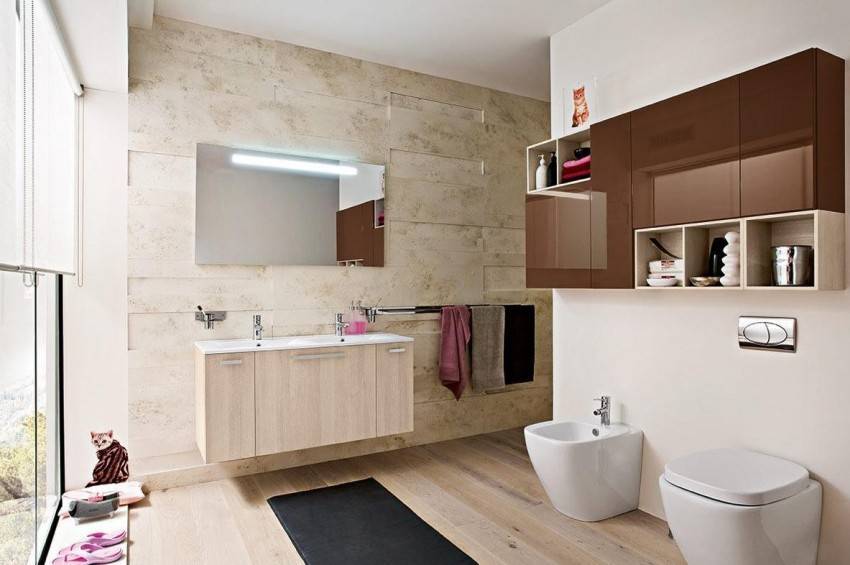 Даже если ванна соединена с туалетом, можно оборудовать уютное пространство. В интерьер хорошо впишется душевая кабина или угловая ванна. Над ней рекомендуется установить умывальник, а под ним повесить сушилки для полотенец.