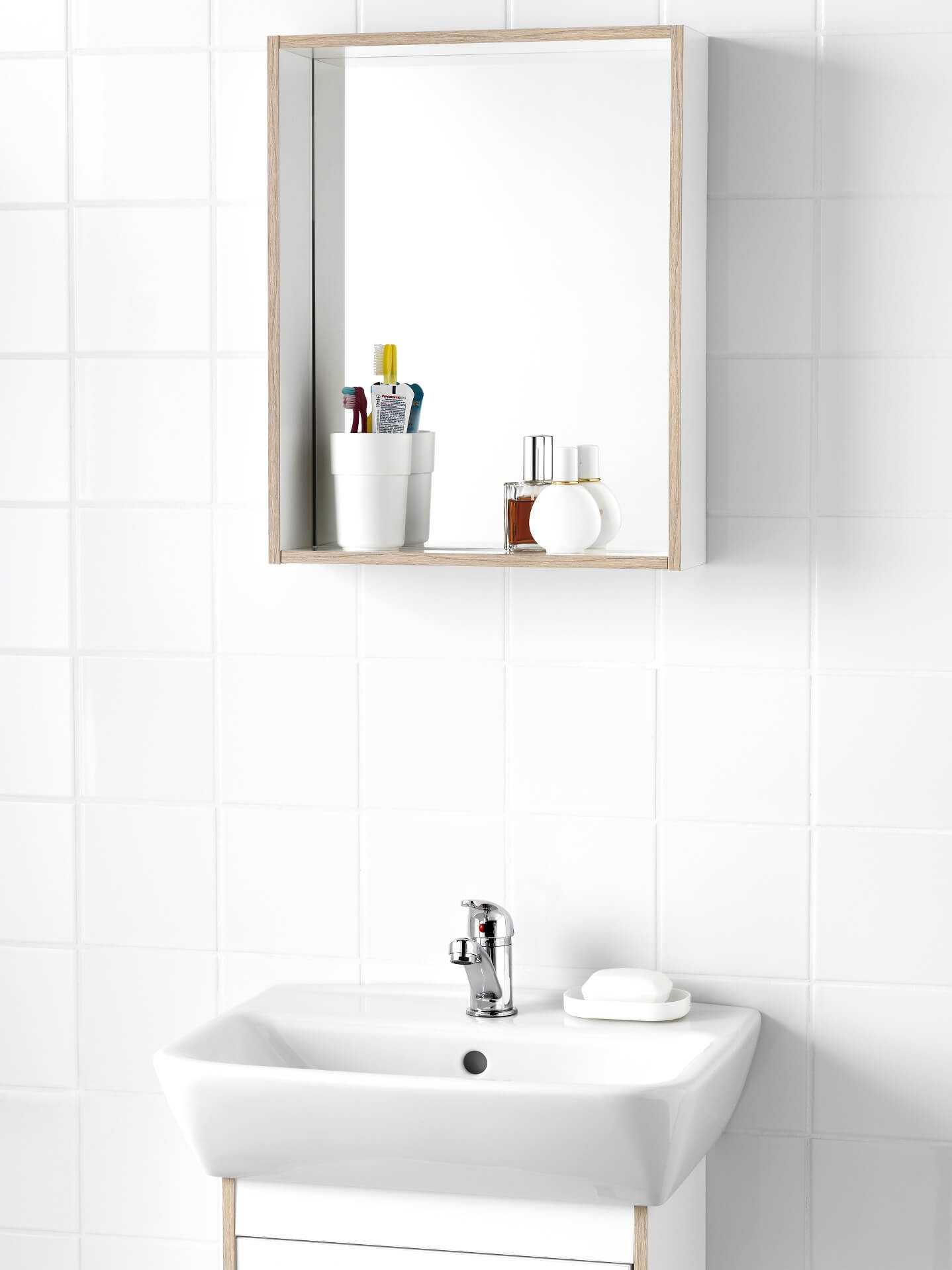 На стене следует повесить стеклянные полки для туалетных принадлежностей, что поможет визуально придать помещению больше площади. Эффект достигается прохождением света через стеклянные поверхности. Для этих же целей можно использовать зеркало, которое должно быть на 5-8 см шире раковины.