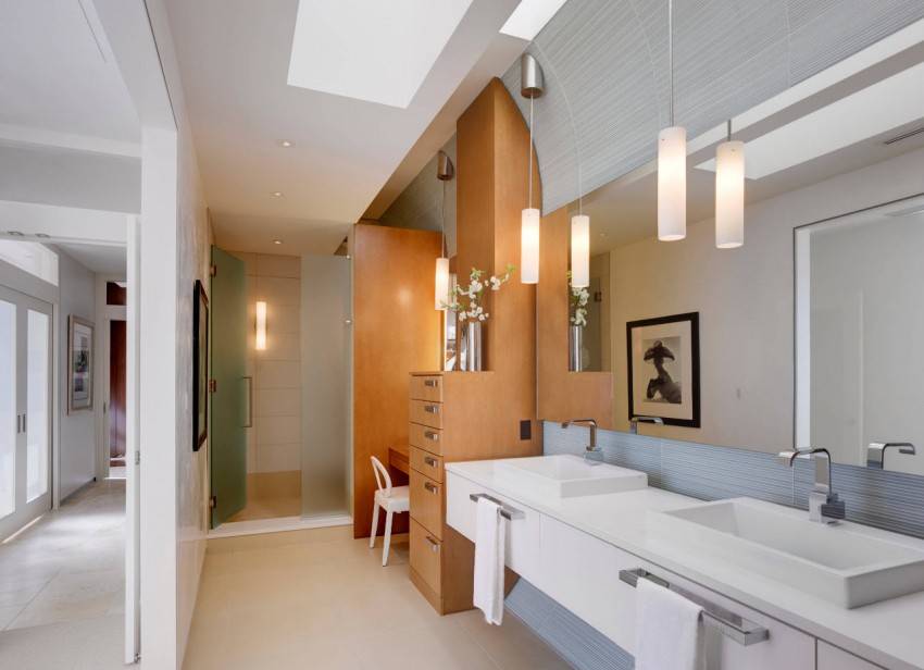 Дизайнеры делят комнату при помощи осветительных приборов или многоуровневого пола, акцентируя внимание на деталях обстановки. Чтобы придать роскоши санузлу, можно выбрать сантехнику, выполненную из камня