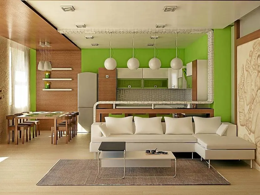 Перегородка между кухней и гостиной дает возможность зонирования на два функциональных участка. Но при желании на этой территории можно выделить большее количество зон. К основным относят: