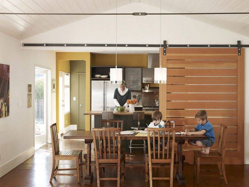 Кроме материала изготовления, покупателю необходимо определиться и с типом конструкции. Накладные полотна перемещаются вдоль стены. Встроенные располагаются внутри дверного проема. Задвижные же двери в момент открытия секций прячут их в перегородке стены. Раздвижные двери между гостиной и кухней являются значимым элементом в интерьере. Если их открыть, комнаты визуально объединятся, а при закрытии зоны станут полностью изолированными друг от друга.