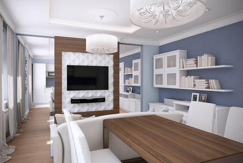 Следует подобрать место для телевизора. Желательно, чтобы экран был виден и с гостиной, и с кухни. В тоже время телевизор не должен находиться рядом с окном. Иначе на экране появятся блики. В крайнем случае стоит приобрести жалюзи, чтобы рассеивать солнечный свет.
