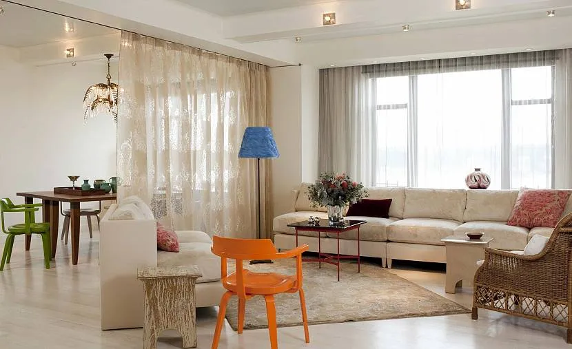 - Монтаж карниза и размещение занавески между зонами — более дешевый вариант перегородки. Для размещения гардины масштабные изменения планировки не нужны. Штору можно легко передвинуть, соединив зоны. Регулярная стирка ткани потребует меньше усилий со стороны хозяйки, чем чистка передвижных дверей или стеклянной стены. При последующем ремонте достаточно сменить занавеску, и новый стиль помещения не будет нарушен.