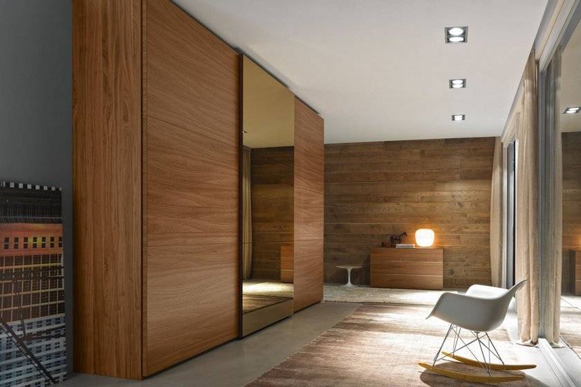 Самым классическим примером оформления раздвижных дверей является использование в качестве основного материала натуральной или искусственной древесины. Такие двери купе чаще всего производятся из ДСП или МДФ и сочетаются со всевозможными цветовыми решениями. Деревянные двери могут быть дополнены стеклянными или кожаными вставками.