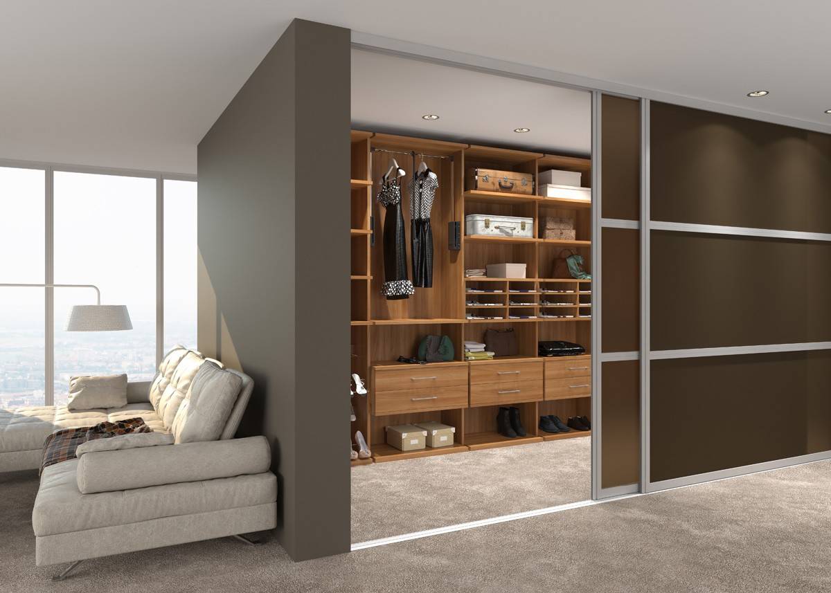 При организации шкафов небольших размеров создается специальная ниша либо раздвижные двери устанавливают в дверной проем на примере межкомнатных. В зависимости от свободной площади, под гардеробную выделяется целое помещение или участок комнаты. Для зонирования пространства в условиях недостатка свободного места используют зеркала, а также различные декоративные элементы в качестве дополнения к оформлению раздвижных дверей.