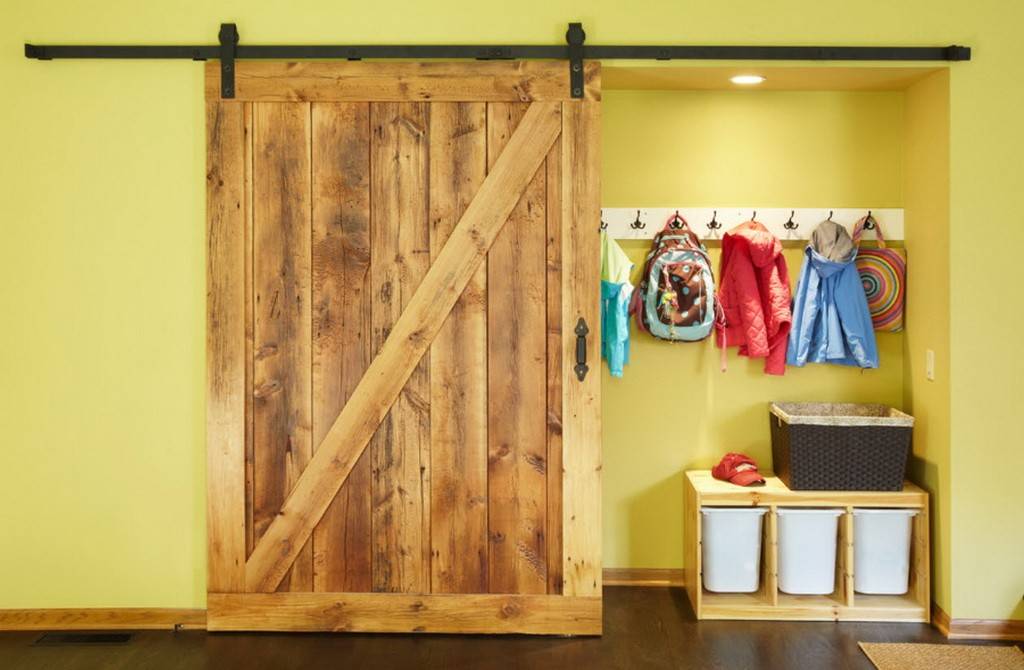 Раздвижные устройства подходят и для небольших помещений. Но в массивном интерьере уместно будут смотреться деревянные двери или навесные конструкции с широкой дверью.