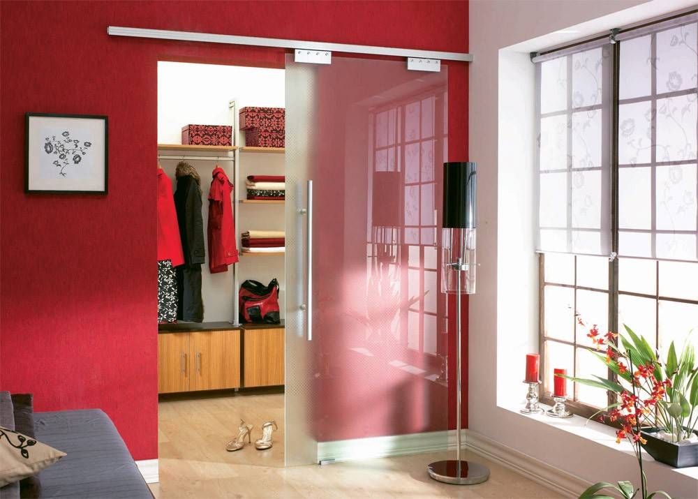 С помощью раздвижных дверей можно скрыть то, что не должны видеть другие, например, гардеробную. С их помощью можно разделить комнату, визуально увеличить пространство и внести разнообразие в ее оформление. Если двери сделать в виде сплошного зеркального полотна, можно визуально увеличить помещение. Особенно актуально это будет для владельцев небольших квартир. Для этих целей подойдут не только полностью зеркальные двери, но и стеклянные с глянцевой поверхностью, в которой будет отражаться комната. Стеклянные двери с матовым напылением смотрятся не менее оригинально.