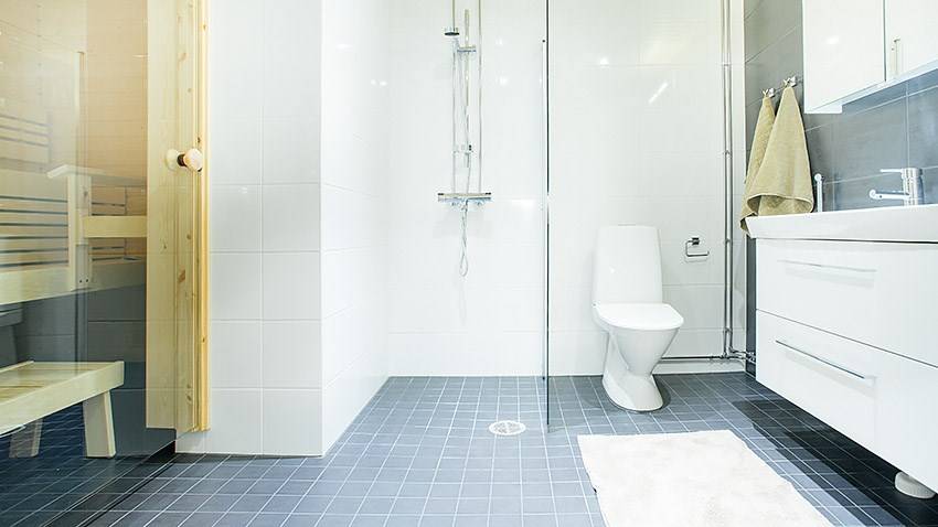 - пол в санузле должен быть не ниже 1,5-2 см, чем в комнатах, при необходимости должно проводится бетонное залитие и установка новой стяжки в жилых помещениях, исключить необходимость такой работы можно установив разделительный порожек.