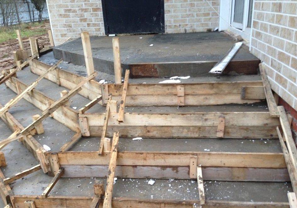 Чтобы сформировать ступени крыльца, временно нужно будет собрать опалубку и уложить новый арматурный каркас. Пока ремонт не завершен, для жильцов многоквартирного дома потребуется собрать лестничный переход — времянку из дерева.