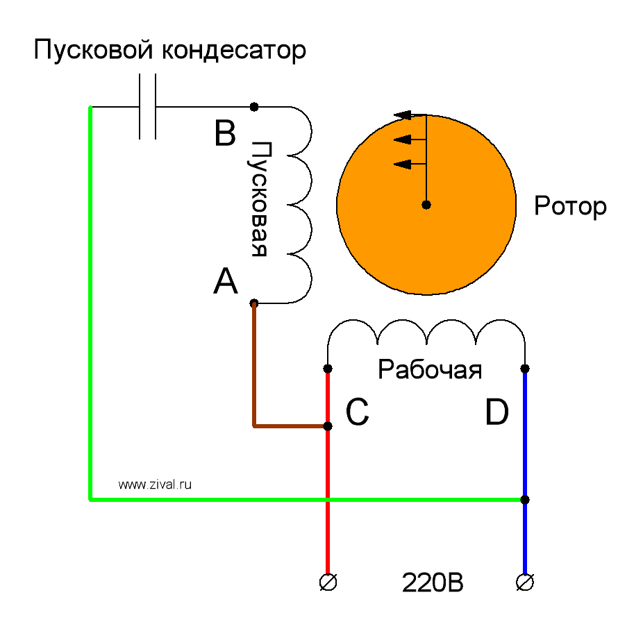 - точками A, B условно обозначены начало и конец пусковой обмотки, для наглядности к этим точкам подключены провода коричневого и зеленого цвета соответственно.
