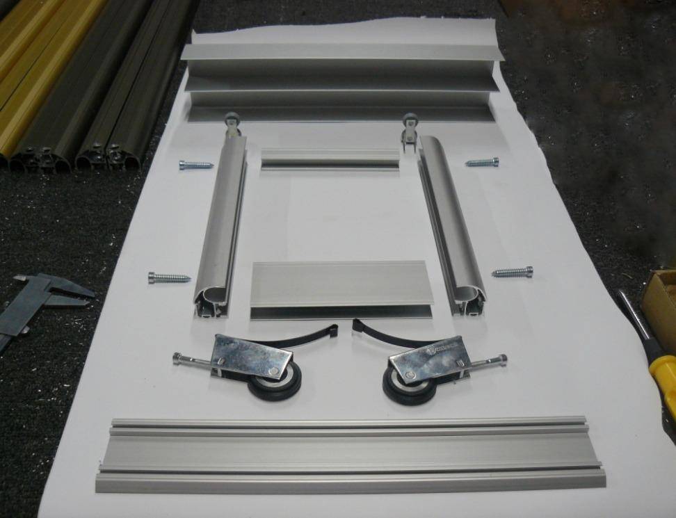 - Набор роликов катается по направляющим, верхней и нижней. Удержание внутри осуществляется за счёт того, что колёсико превышает по размеру зазор между верхним и нижним изгибом профиля.