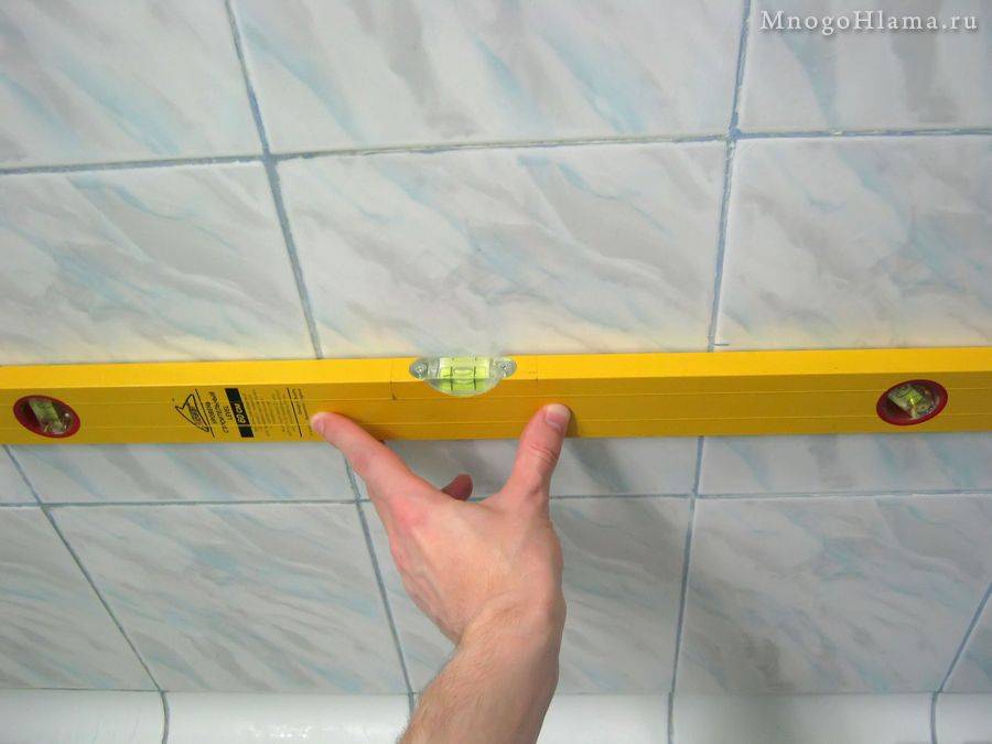 Затем на глазок или с помощью уровня чертим горизонтальную линию на плитке.