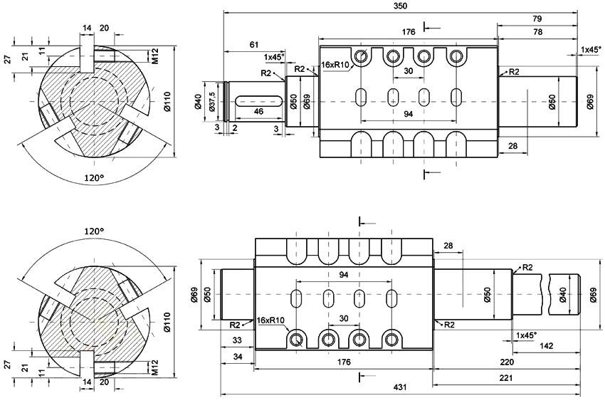 Из квадратной заготовки вытачиваем валы с двух сторон. В центре сверлим отверстия для 4 ножей, в них нарезается резьба. Закругленные края вставляют в подшипники. Изготавливается барабан из 4 шпилек, и двух стальных пластин в которых прорезаются отверстия под подшипники.