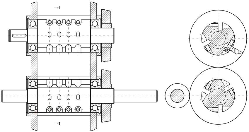 Прочно закрепляют подшипники и шкивы на валу, с противоположной стороны устанавливают шестерни. На заранее подготовленную раму устанавливаем корпус с режущим механизмом и двигатель. Передача крутящего момента от привода будет производиться при помощи ремней через шкивы на валах двигателя и ножей.