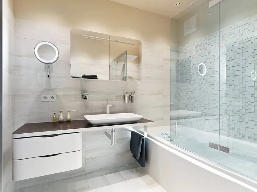 Если позволяет бюджет, стоит обратить внимание на ванну с закрытой душевой кабиной. Поскольку дверки в ней закрываются, можно принимать душ, не боясь, что вода зальет все вокруг