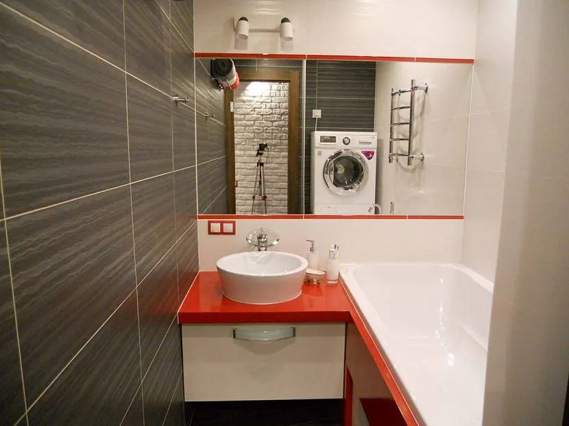 Если вход располагается ближе к стене, можно разместить умывальник со стиралкой внизу с правой стороны, большую классическую ванну напротив входа.