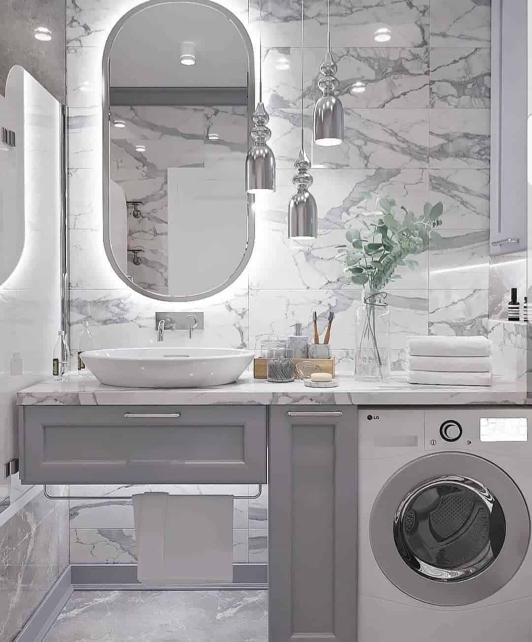 В маленьком помещении, такой атрибут как раковина, можно сделать подвесной и тогда, пространство, что образовалось под ней можно заполнить, либо стиральной машиной, либо напольной тумбочкой.