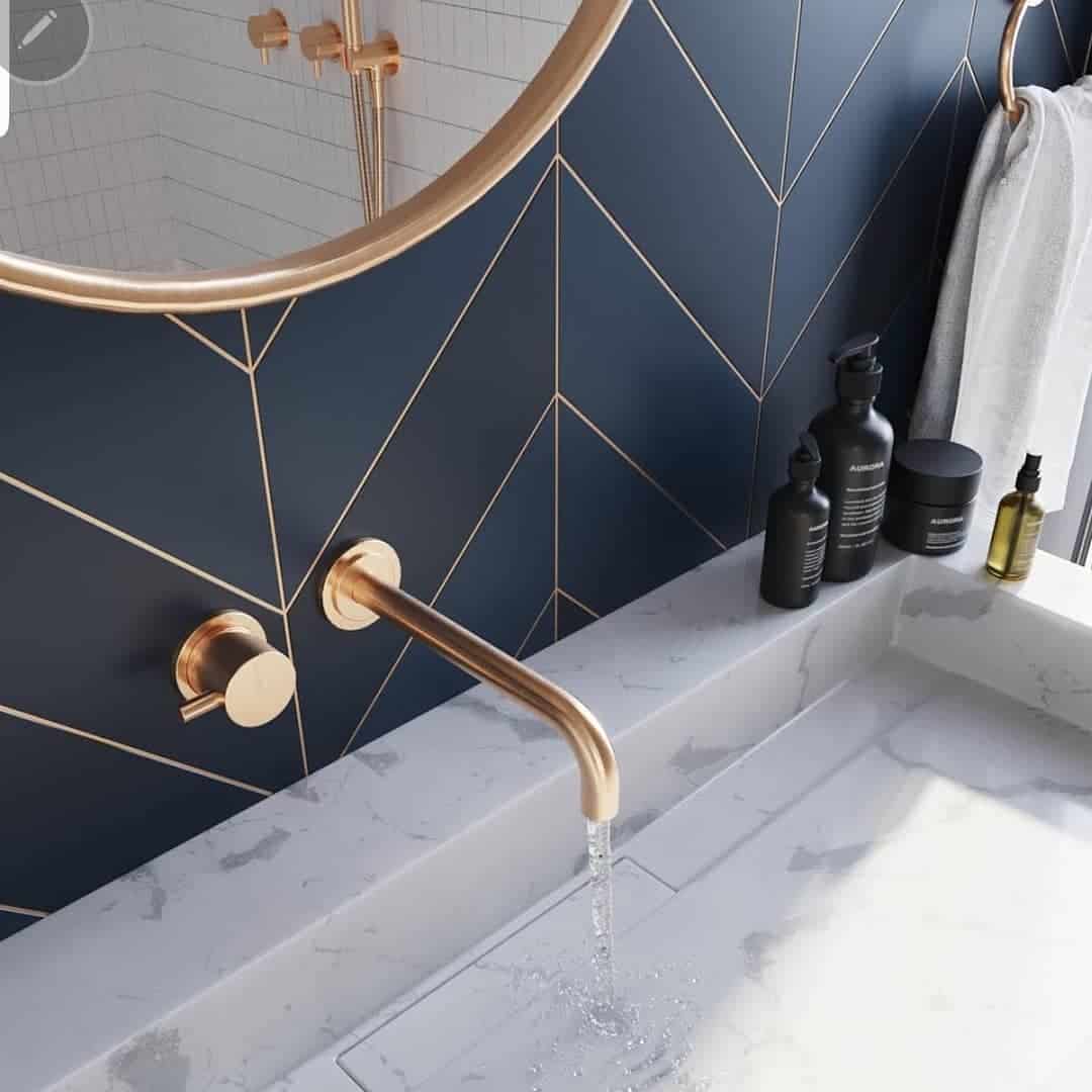 Синий цвет относится к холодным, поэтому его рекомендуется разбавлять более теплыми (золотистым, желтым, оранжевым) тонами, которые можно использовать в элементах декора или рисунках на кафеле.