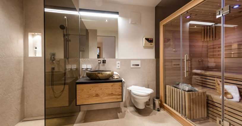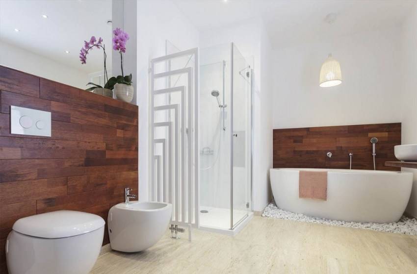 Это означает, что современный дизайн должен быть создан с использованием натурального дерева и натурального камня. Эти материалы имеют естественно уникальный рисунок кроя. Благодаря ему ванная комната не нуждается в дополнительной отделке.