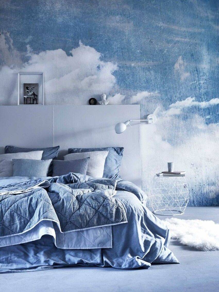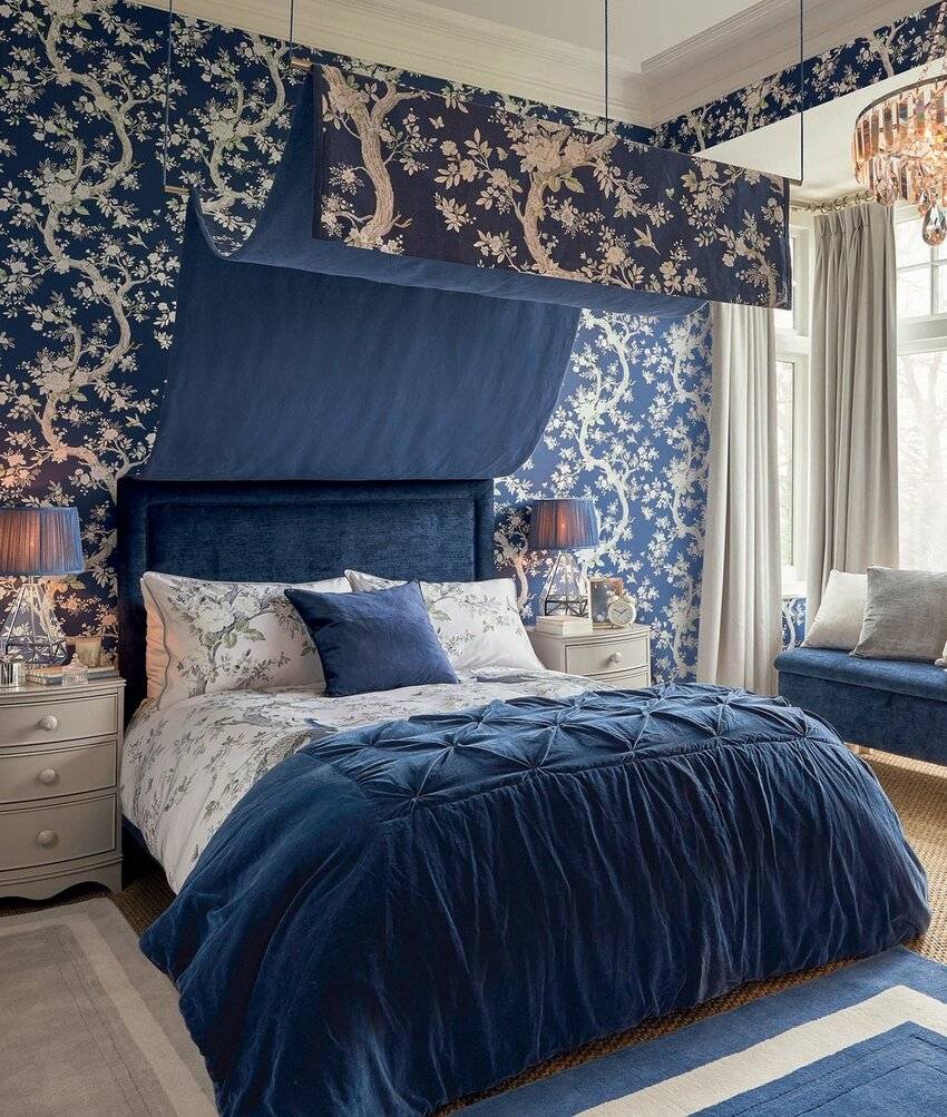 Синие обои в интерьере спальни могут быть основным акцентом, а также нейтральным элементом.