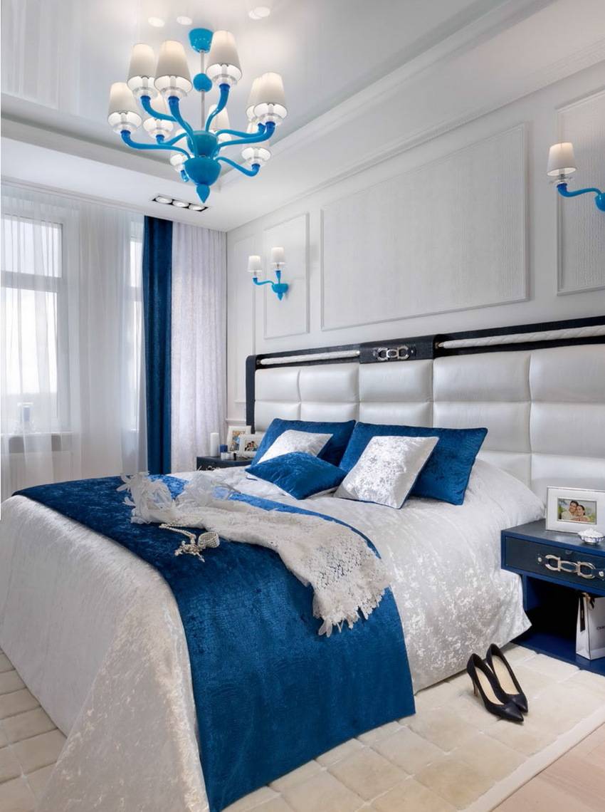 Синий и серебристый (золотистый). Такую гармонию нужно обязательно разбавлять легкими пастельными оттенками. Что касается серебра и золота, то эти тона очень удачно будут смотреться в элементах декора: обрамлениях картин, молдингах на мебели, фурнитуре.