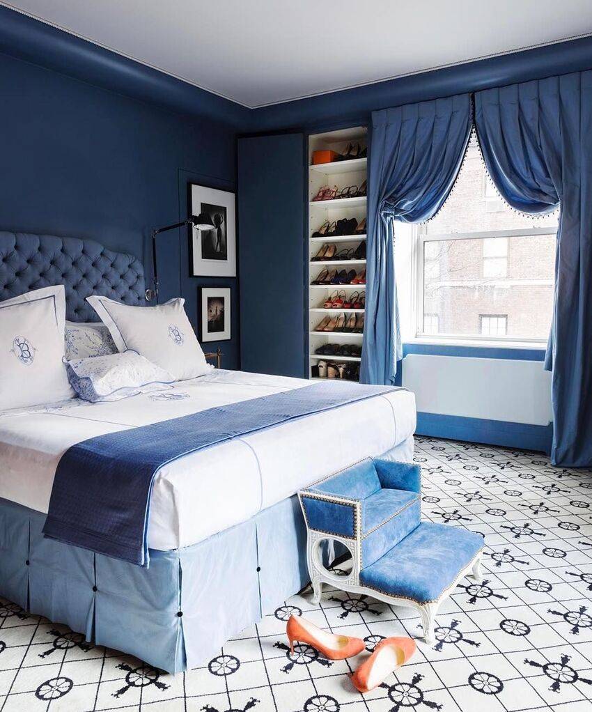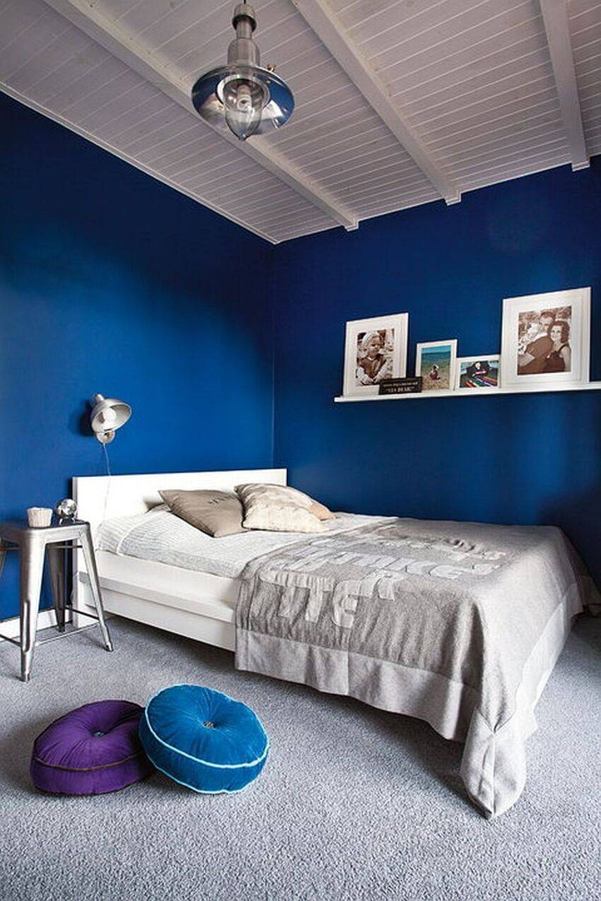 Слишком яркий и насыщенный синий цвет для спальни может вызывать тревожность, поэтому лучше обрати внимание на приглушенные или пастельные тона. Добавить акценты можно с помощью занавесок, покрывал и декоративных подушек