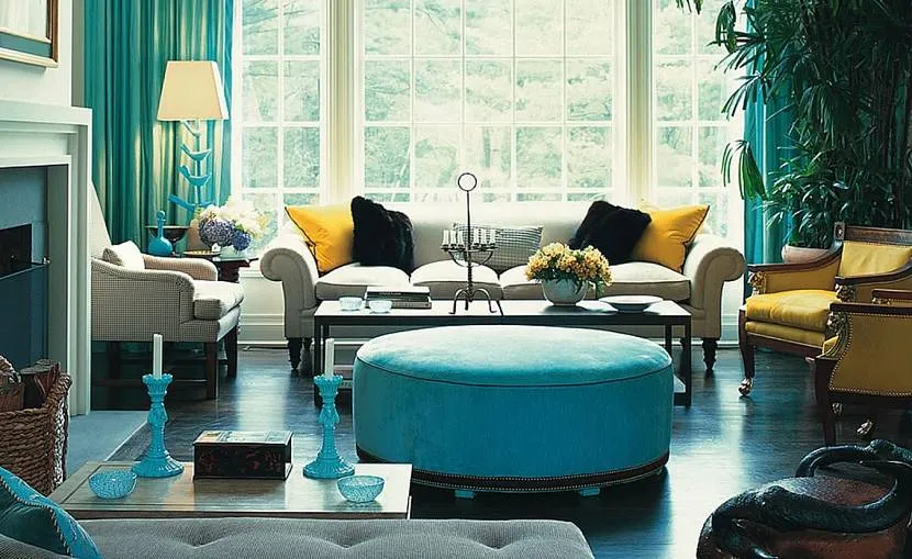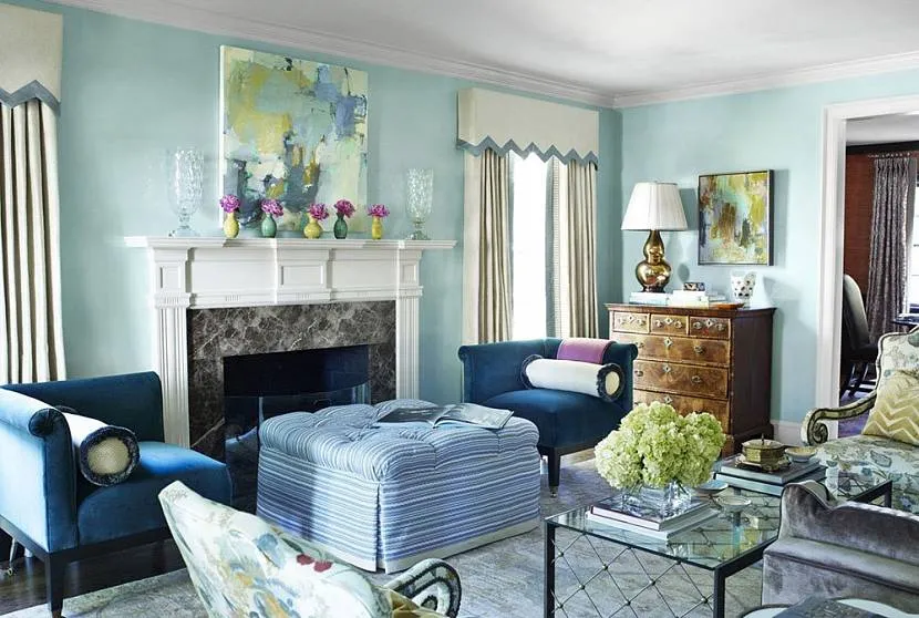 Для гостиной хороший вариант — пастельные, светлые синие тона (васильковый, лазурный, бирюзовый), разбавленные яркими цветовыми акцентами.