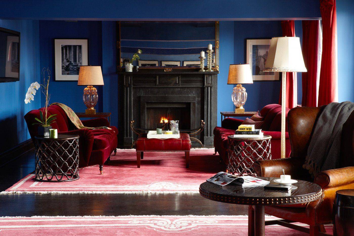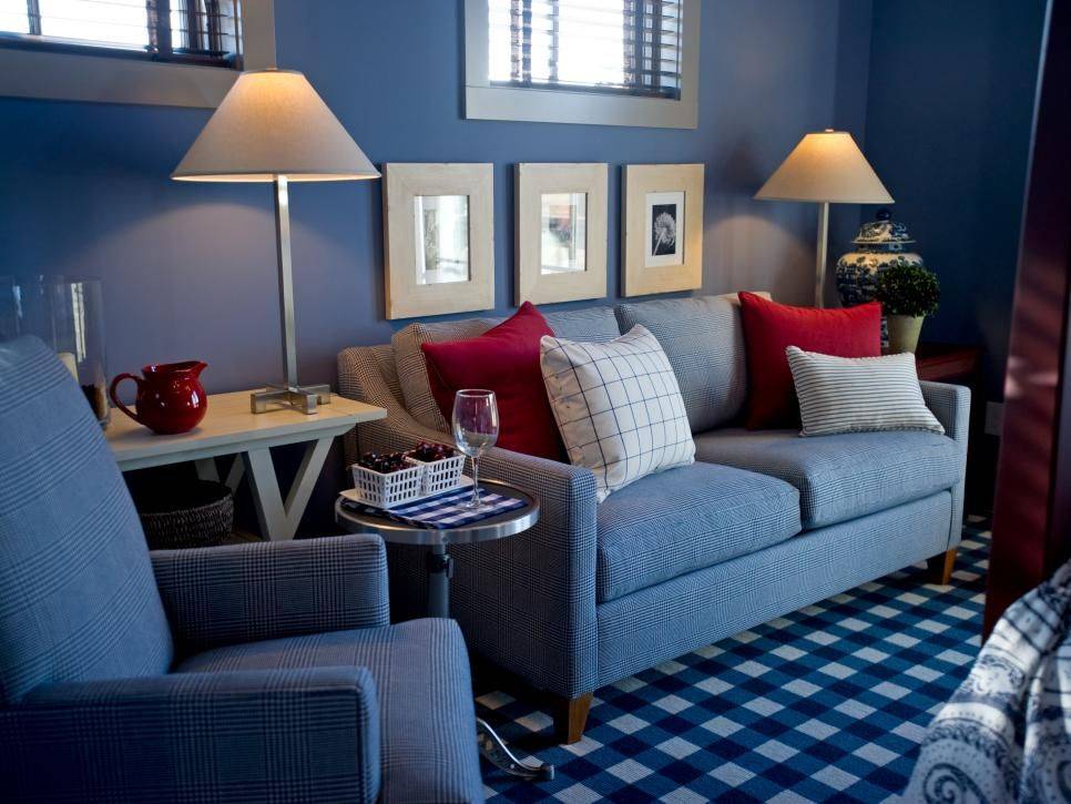 Тандем синего и красного оттенка в интерьере гостиной кантриИсточник stroyday.com