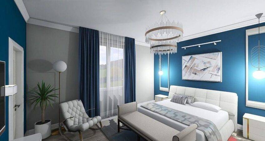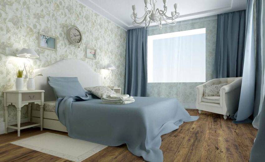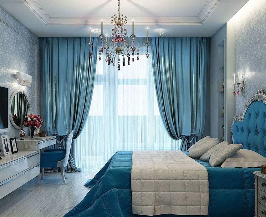 Синие шторы в спальню можно повесить при наличии светлых оттенков стен