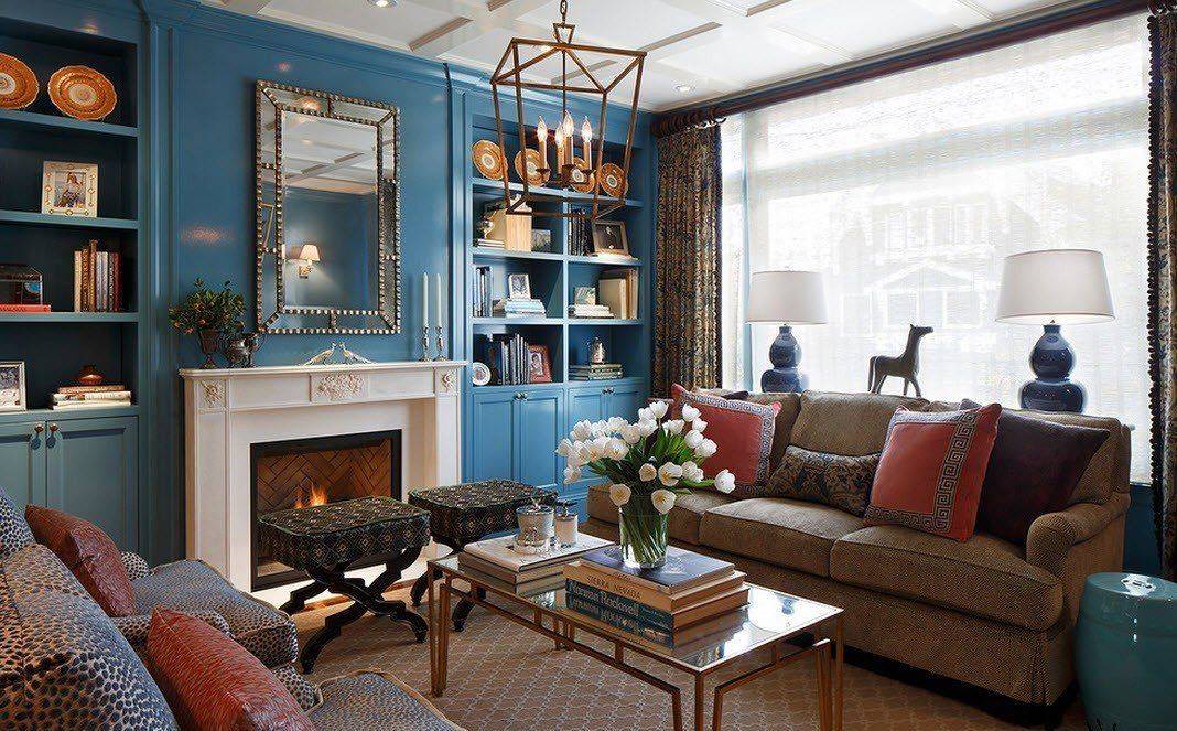 Берлинская лазурь в сочетании с темно-синим будет неплохим решением. Если разбавить тандем кремово-бежевыми оттенками, гостиная получится уютной, светлой и теплой.