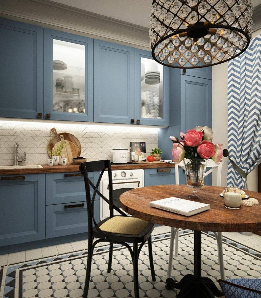 Классика – здесь синий может присутствовать в шторах и скатерти, а вот гарнитур лучше выбрать из дерева. Синими в такой кухне могут быть декоративные элементы и люстра.