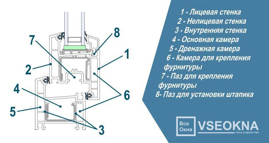На поперечном срезе профиля видны герметичные стенки между нескольких продольных полостей. Полости именуются камерами. Их количество влияет на теплоизолирующие и прочностные характеристики окна.