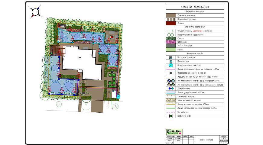 На плане рисуете зоны полива, источник воды, его расположение. Попутно прорисовываете как будет проходить магистральный трубопровод. Если собираетесь обрызгивать дождевателями, нарисуйте зоны их действия. Они должны перекрываться и неполитых участков быть не должно.