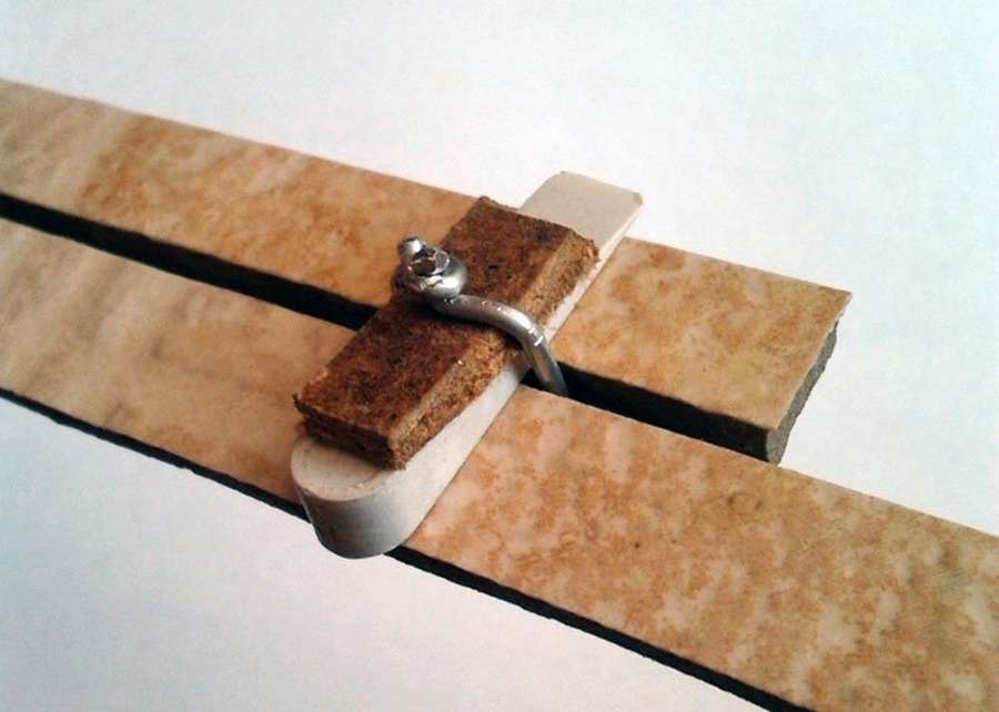 Установив получившийся механизм между плитками, верхние концы проволоки закручивают в спиралевидную форму. Предварительно под проволоку необходимо вставить кусочки оргалита. Таким образом, происходит фиксация материалов. После стопроцентного высыхания клеевого раствора можно убрать зажимы. Выступающие части петли отрезаются кусачками.