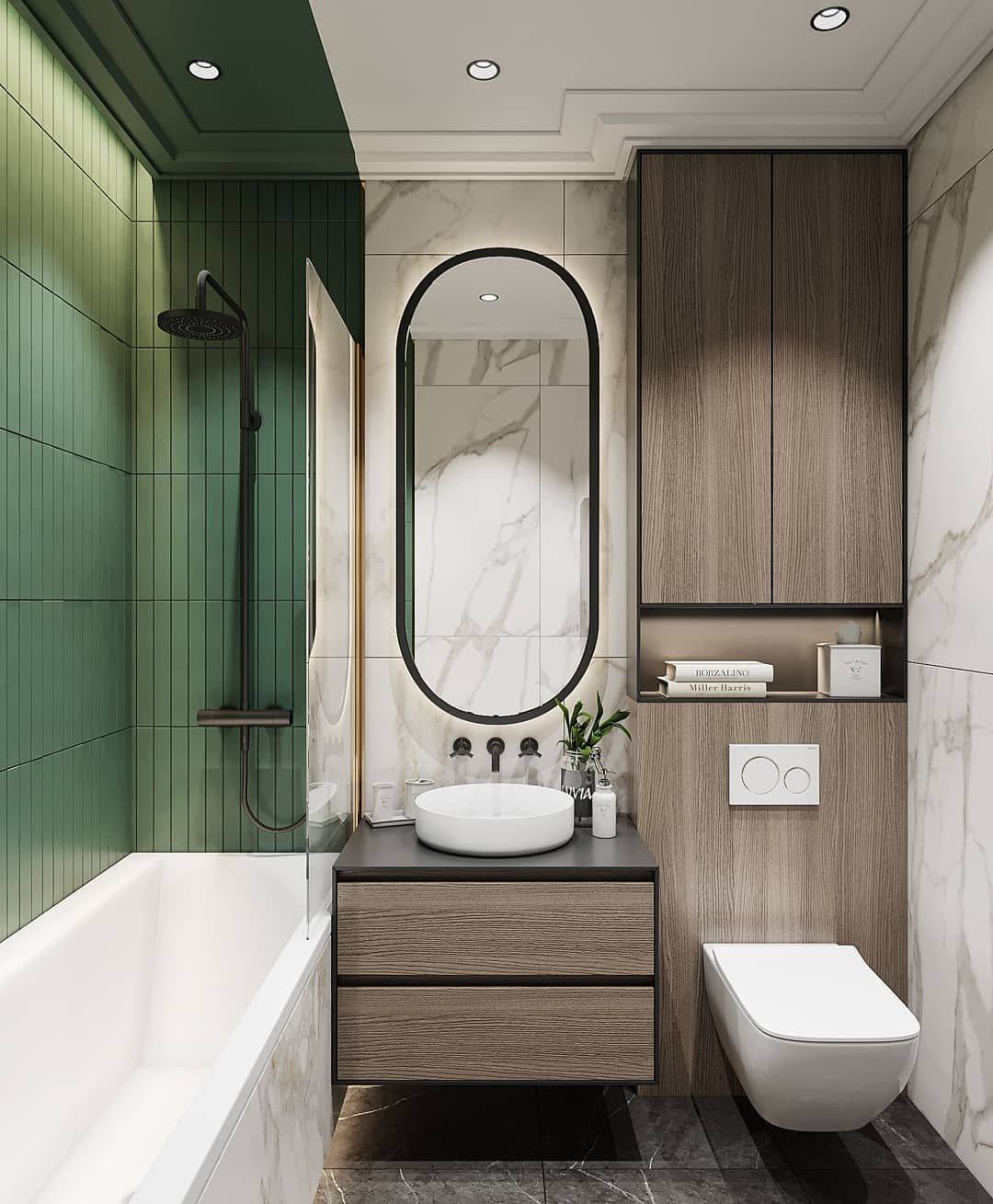 - Никогда не используйте более двух типов плитки. Выбирайте темные тона для пола и более светлые тона для стен. Если перегружать его узорами или темным цветом для стен, то это явный избыток. Пространство сужается, и вы чувствуете себя еще теснее и неудобнее. Техника, раковина, унитаз — все должно быть белого цвета. Как вы уже поняли, лучше всего установить компактную ванну или небольшую душевую кабину.