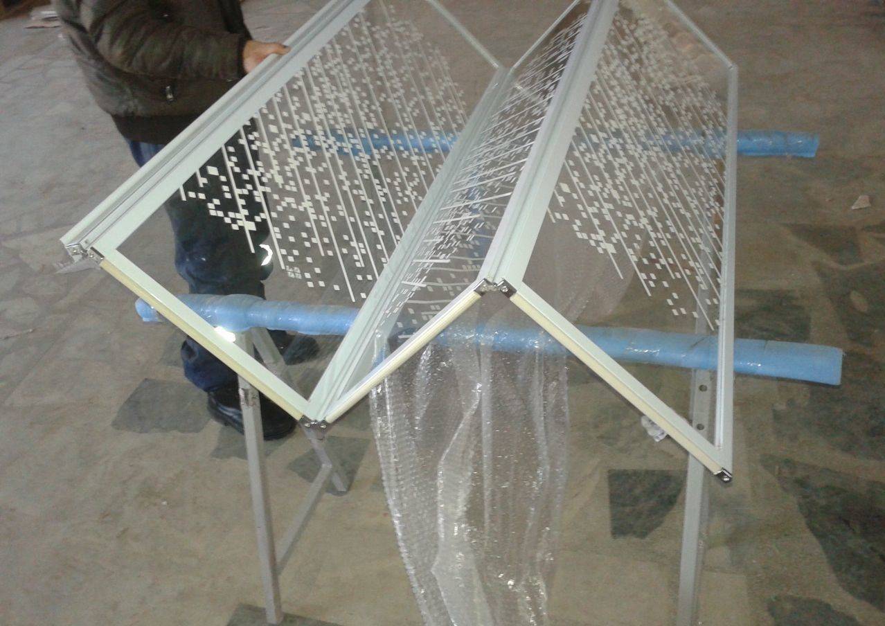 - Каркасная. Стеклянное полотно, окаймленной стальной кромкой с двух или четырех сторон, закрепленное на стене или к потолку и краю чаши.