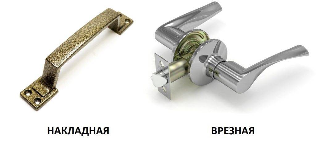 Ручка имеет два основных подвида: накладная или врезная. Первый вариант не требует сквозного сверления в теле полотна, процесс установки производится на поверхности. Врезная рукоять требует наличия отверстия в конструкции и стойке.