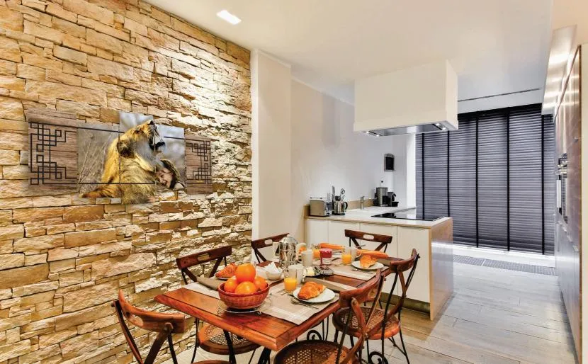 Фотообои или 3D обои – наиболее пополняй акцент. Их можно расположить над обеденной зоной, на целой свободной стене или в виде фартука по периметру кухни.