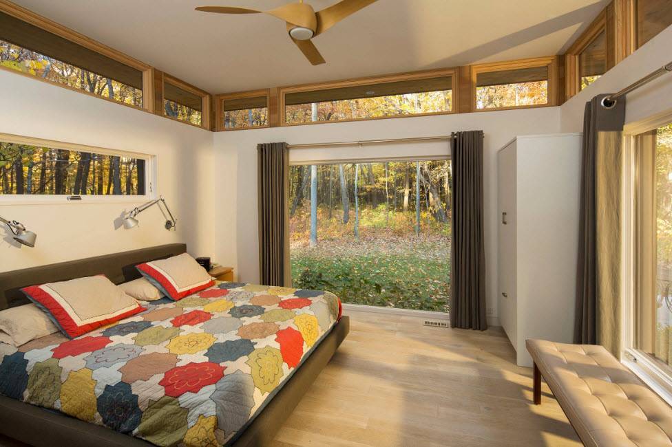 Для создания большой комнаты с несколькими окнами можно объединить спальню и гостиную, благодаря чему у окон будет расположена зона для гостей, а в отдаленном угле кровать, скрытая за ширмой или комодом. Если окна находятся перпендикулярно друг к другу, то скрыться от солнца можно при помощи плотных штор, расположив кровать возле одного из проемов или между ними.