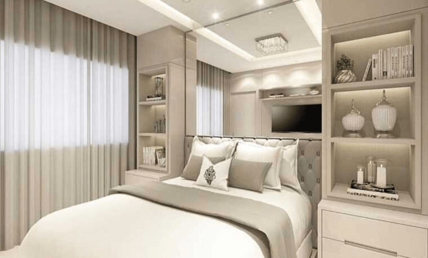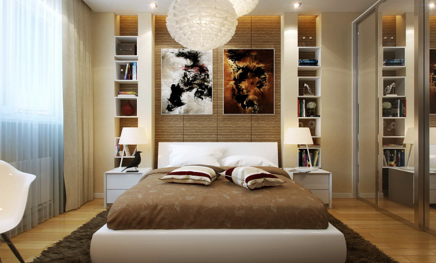Теперь стоит сказать о нишах. Их применение вполне допустимо в спальне с прямоугольной планировкой. Ниши можно разместить прямо в перегородке либо же в продольных стенах. Такой ход немного зрительно сделает спальню шире.