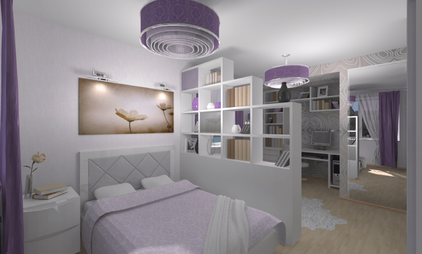 Перегородки позволяют разделить спальное помещение на зону для сна и другую функционирующую область: будь то рабочее пространство, зона для маленького ребенка, если в семье недавно произошло пополнение, а также пространство с туалетным столиком, зеркалом и комодом. Мало ли под какие потребности необходимо разграничить помещение.