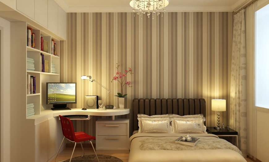 Использовать полоски и квадратные мотивы можно на шторах, покрывале, обивке мебели. Нужно избегать их направления вдоль длинных стен спальни.