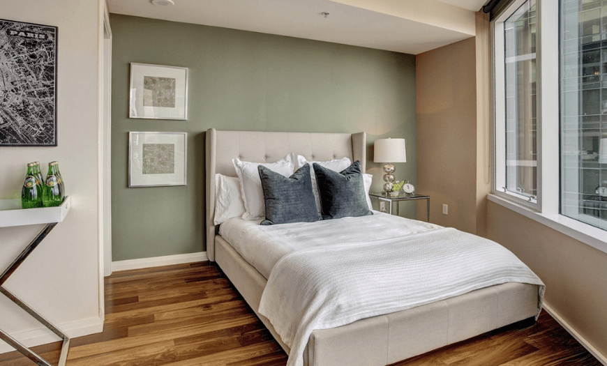 В числе оттенков узкой спальни, которые более предпочтительны: бежевый, кремовый, сиреневый, нежный оливковый, охристый, светло-серый, персиковый, фисташковый. Что касается потолка, его стоит сделать белым, либо нежно-кремовым, молочным, в зависимости от оттенка стен.