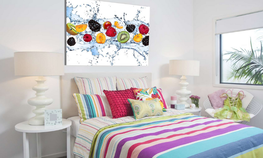 Не нужно думать, что дизайн небольшой спальни должен быть однотонным и скучным. Оживить его помогут насыщенные цветом акценты. Применяют для декорирования фотографии и картинки в элегантных рамках, постеры.
